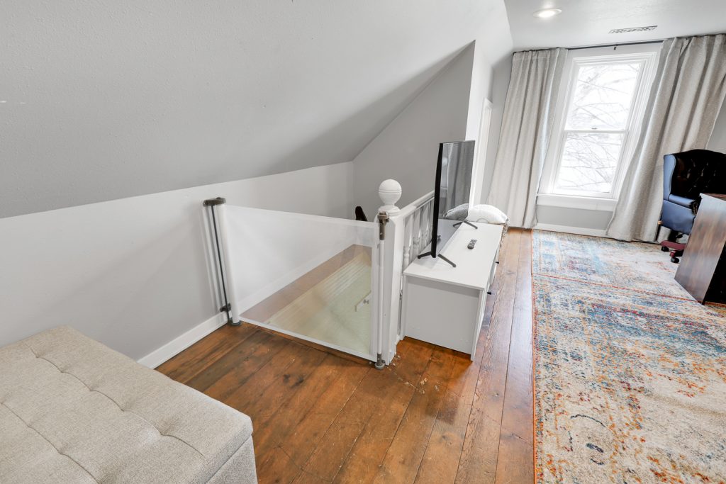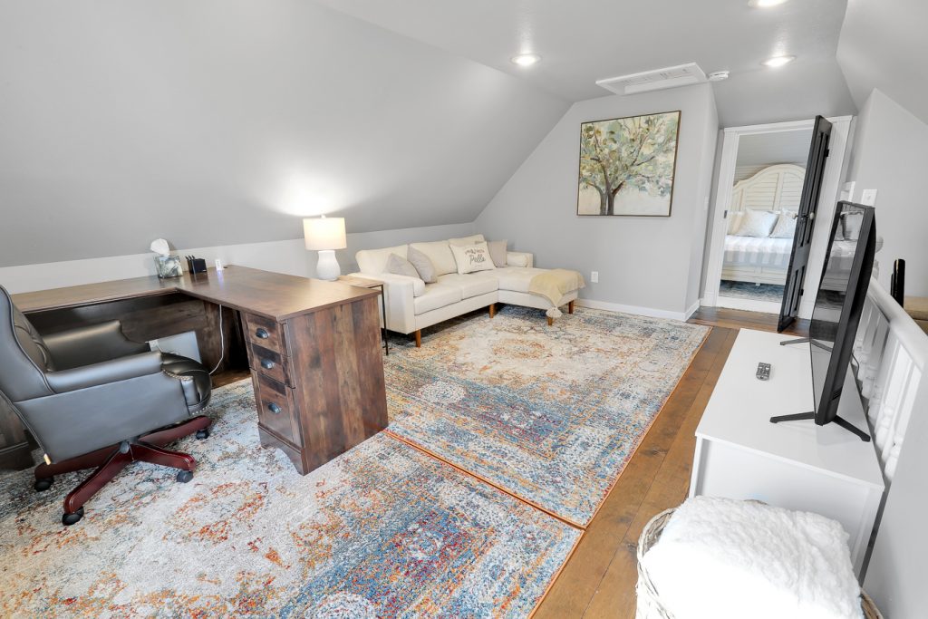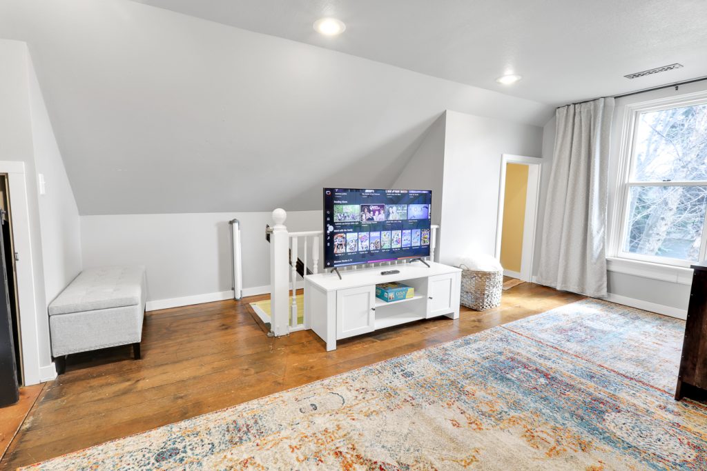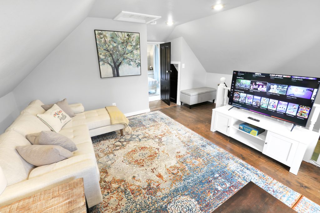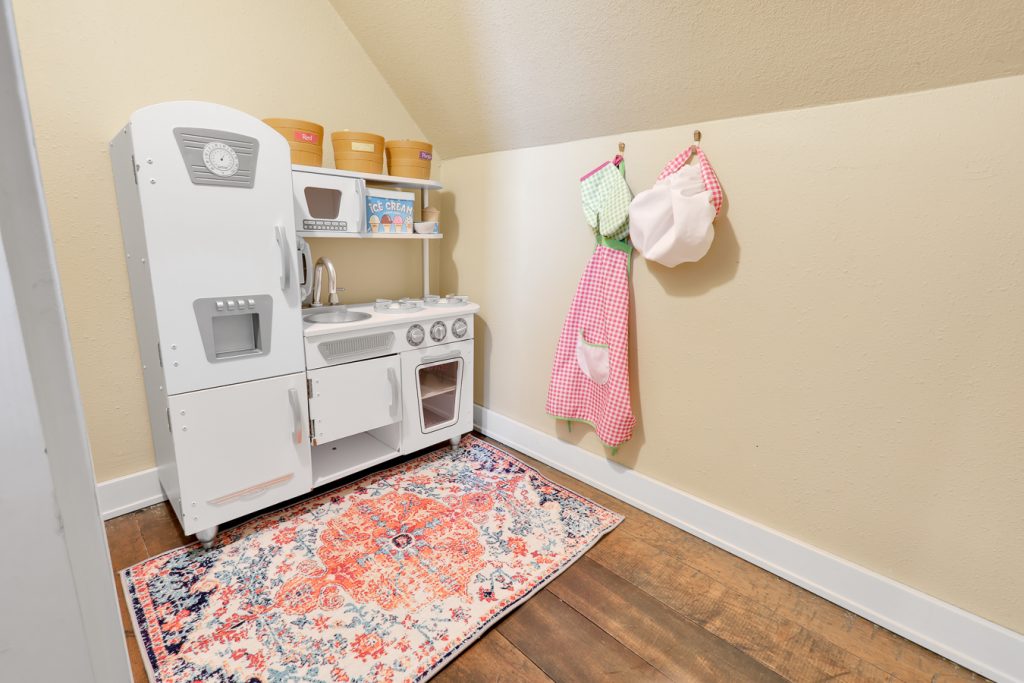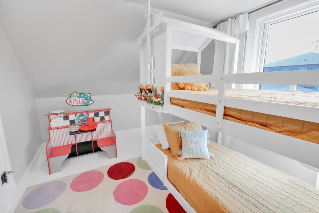 The second level offers a delightful bonus living space, perfect for adults and young explorers! Two interconnected bedrooms comprise a Queen-sized room adorned with elegant furniture and finishing, alongside a charming kid’s bedroom featuring a whimsical Windmill bunk-bed embellished with flowers, as well as a standalone twin bed. Additionally, there’s a large restaurant diner play-set to spark your children’s’ imagination. Another generous living area awaits, complete with an extra smart TV, a large workstation with a printer for your business needs, and a concealed cubby play area equipped with a children’s kitchenette play-set.