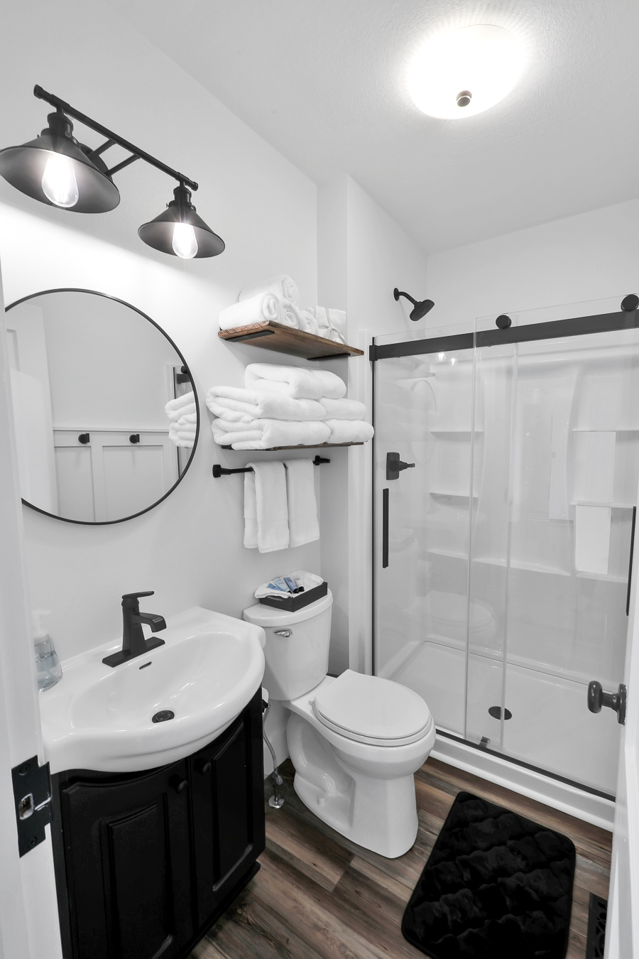 Experience the beauty of a newly remodeled bathroom, showcasing a walk-in shower adorned with frameless sliding glass doors, modern hardware, and fixtures. Enhancing the space are board and batten wainscoting, floating wooden shelves, and luxury vinyl flooring. Indulge in a selection of fresh, soft white towels for a touch of luxury and comfort.