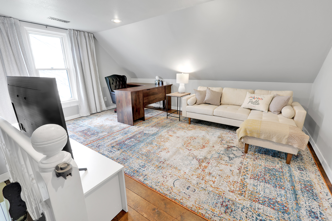 Upstairs, you’ll discover a distinct full living area, complete with an additional sectional couch and a second 50-inch smart TV, along with a microfridge for added convenience. For safety, a baby gate is installed at the top of the stairs. Adjacent, there’s a spacious work area, equipped with a charging station and a laser printer to meet all your business needs. Tucked away in the corner is a hidden cubby adorned with a children’s toy kitchenette, inviting the little ones to embark on imaginative adventures.