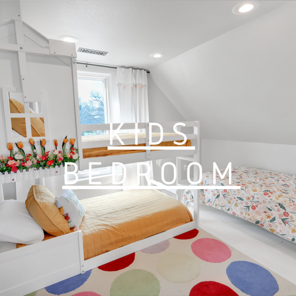 Also upstairs, you’ll find a magical room designed for young explorers. It features a windmill-themed bunk bed embellished with playful flower boxes and equipped with two twin mattresses. Additionally, there’s a standalone third twin bed for extra sleeping space. Completing the setup is a kids’ area rug and a large diner-style play station, providing endless entertainment for the little ones.