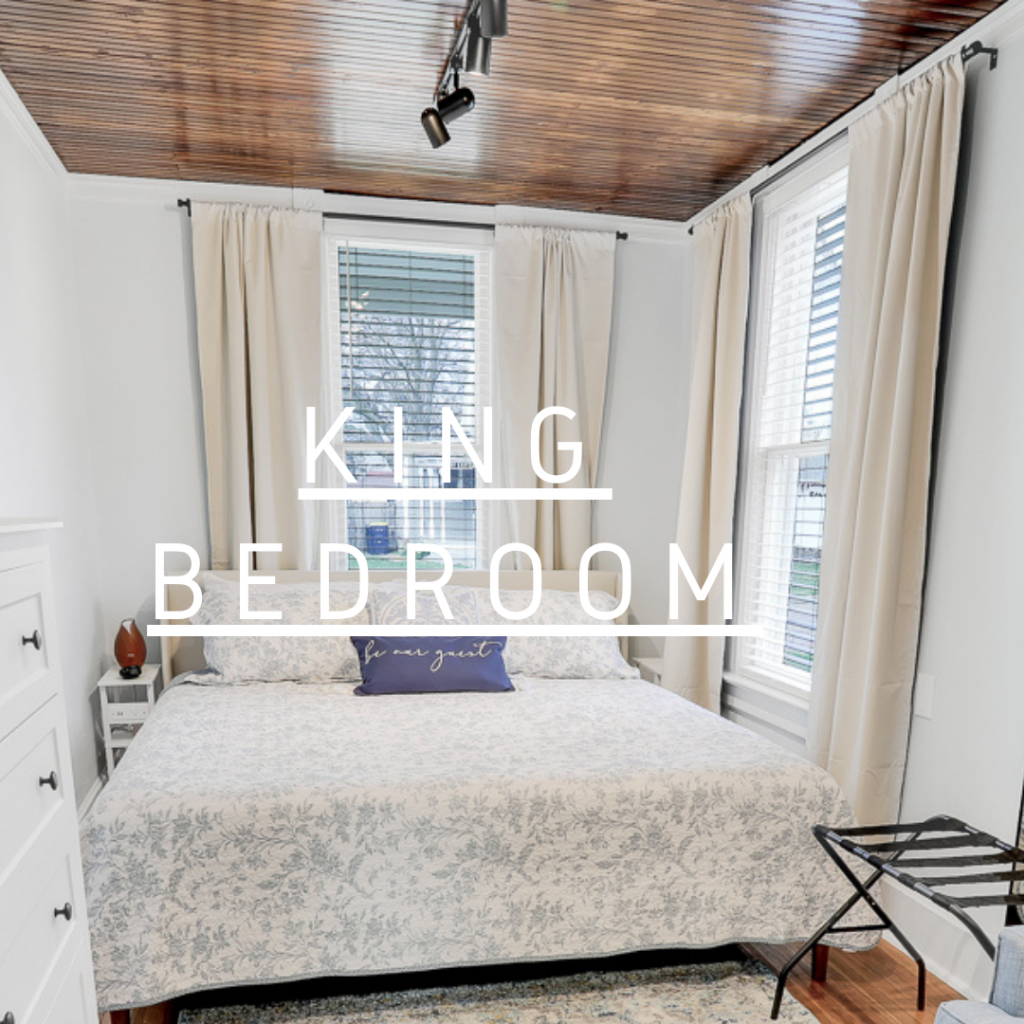 On the main level, enjoy a comfortable king-sized bed with a choice of pillows, including down alternative and memory foam gel options. Each nightstand features a convenient charging station, complemented by track lighting and blackout curtains for a restful sleep. Unwind in the private sitting room, and utilize the dresser, and full-sized mirror.